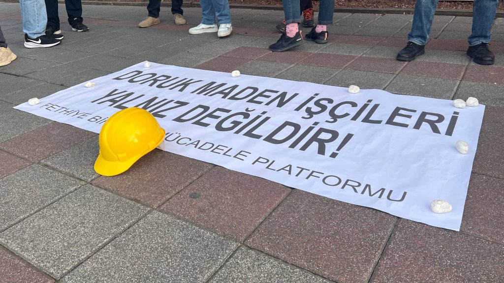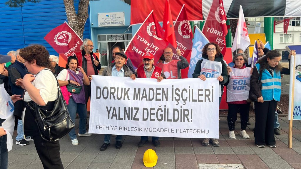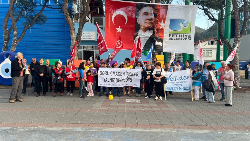 Muğla’nın Fethiye ilçesinde, Fethiye Birleşik Mücadele Platformu dün (25 Nisan) saat 18.30’da Fethiye Belediyesi Özer Olgun Kültür Merkezi önünde bir araya geldi ve Doruk Madencilik işçilerinin Ankara’daki grevine destek olmak için basın açıklaması yaptı.