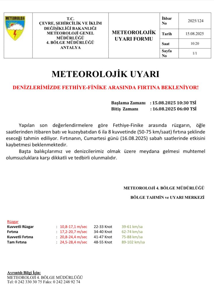 Meteoroloji tarafından yapılan uyarıya göre; bugün (15 Ağustos) Muğla’nın Fethiye ilçesi ile Antalya’nın Finike ilçesi arası denizlerde rüzgarın fırtına şeklinde eseceği tahmin ediliyor.