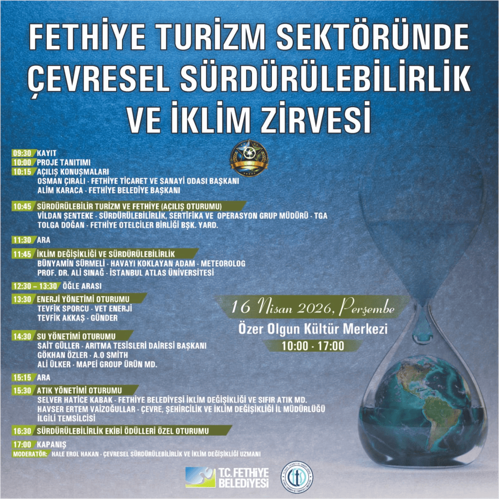 Fethiye Belediyesi ve Fethiye Ticaret ve Sanayi Odası (FTSO) iş birliğinde 16 Nisan 2026 Perşembe günü saat 10:00’da Özer Olgun Kültür Merkezi’nde “Fethiye Turizm Sektöründe Çevresel Sürdürülebilirlik ve İklim Zirvesi” gerçekleştirilecek.