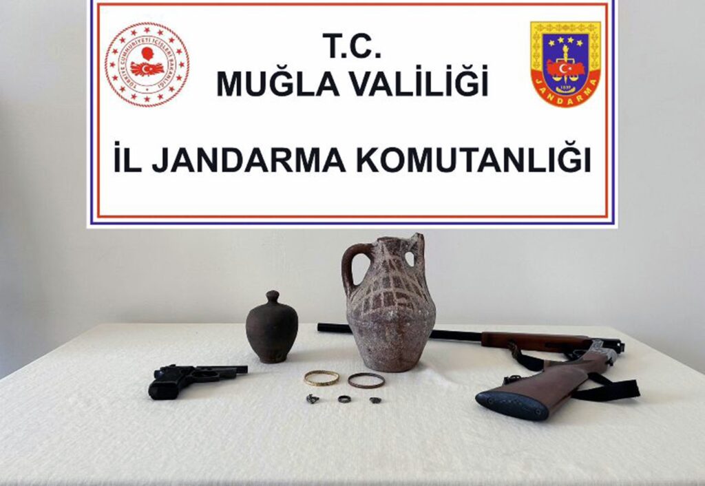 Jandarma İstihbarat Şube Müdürlüğü ve Fethiye İlçe Jandarma Komutanlığı ekiplerince şüphelilerin ikametlerinde yapılan aramada; üç adet Roma dönemine ait yüzük, iki adet tarihi eser niteliği olduğu değerlendirilen testi, iki adet tarihi eser niteliği olduğu değerlendirilen bilezik, av tüfeği ve kurusıkıdan bozma tabanca ele geçirildi.