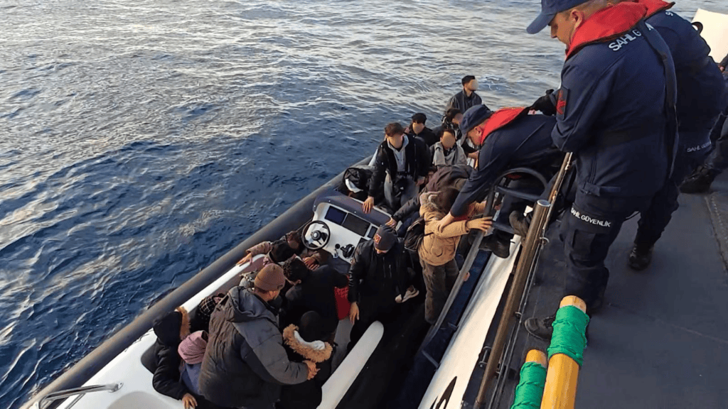 Sahil Güvenlik Komutanlığı’nın aktardığına göre, görevlendirilen Sahil Güvenlik Gemisi (TCSG-65) ve Sahil Güvenlik Botları (KB-82, KB-15) tarafından hareketli fiber karinalı lastik bot durduruldu.