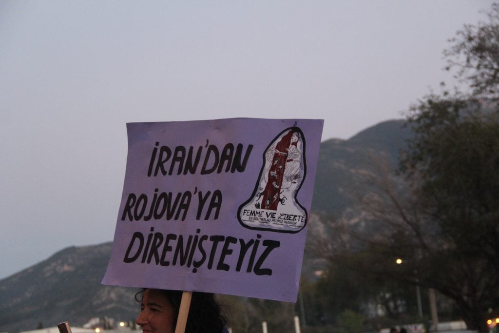 “İran’da Filistin’de, Rojawa’da, Ukrayna’da, Suriye’de, Afganistan’da dünyanın dört bir yanında kadınlar bombalar altında doğuruyor, göç yollarında şiddete uğruyor, bedenleri savaş ganimeti gibi hedef alınıyor. Savaş politikaları erkek egemen iktidarların eseri, bedelini ödeyen ise kadınlar ve çocuklar oluyor.”