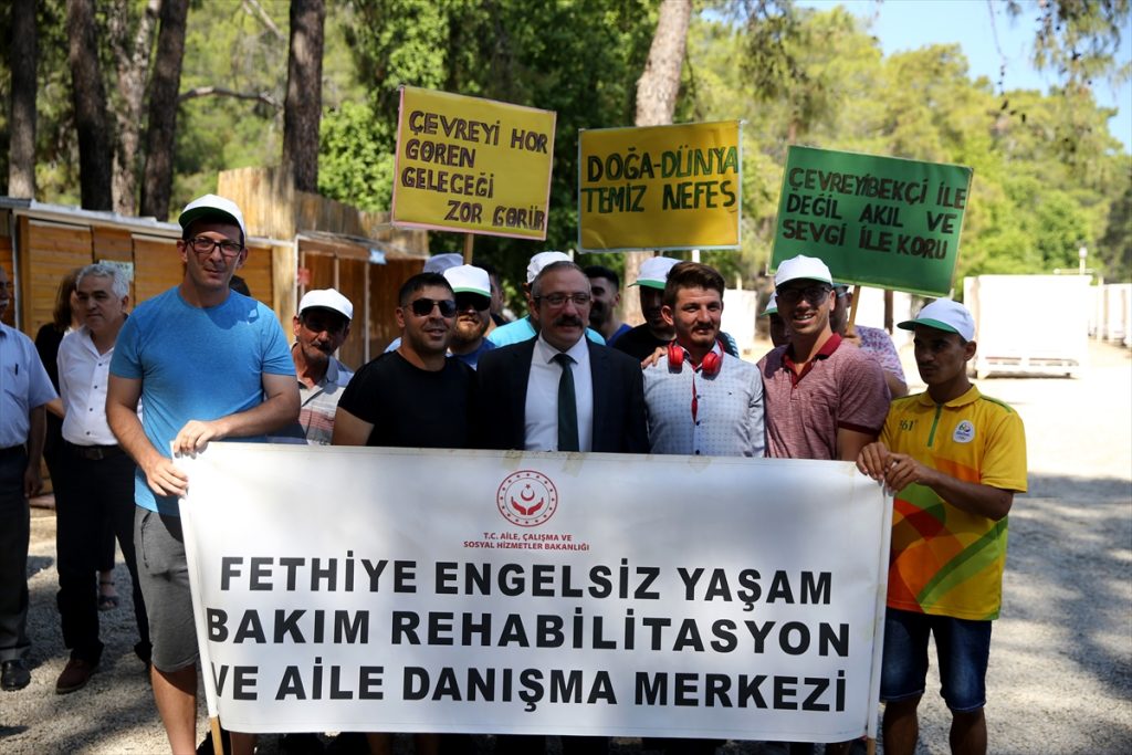 Mavi Bayrak çekme törenine Fethiye Engelsiz Yaşam Bakım Rehabilitasyon ve Aile Danışma Merkezinde tedavi gören engelliler; “Çevreyi hor gören geleceğini zor görür”, “Doğa-dünya temiz nefes” ve “Çevreyi bekçi ile değil akıl ve sevgi ile koru” yazılı dövizlerle katıldı.