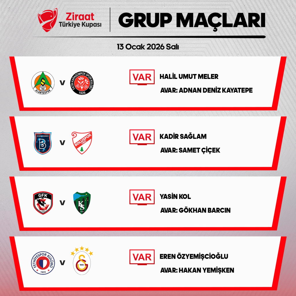 Ziraat Türkiye Kupası’nda 13 Ocak Salı günü oynanacak karşılaşmaların VAR ve AVAR hakemleri açıklandı. Türkiye Futbol Federasyonu Merkez Hakem Kurulu tarafından yapılan açıklamayla birlikte Fethiyespor – Galatasaray maçı VAR hakemi ve hakem kadrosu netleşti.