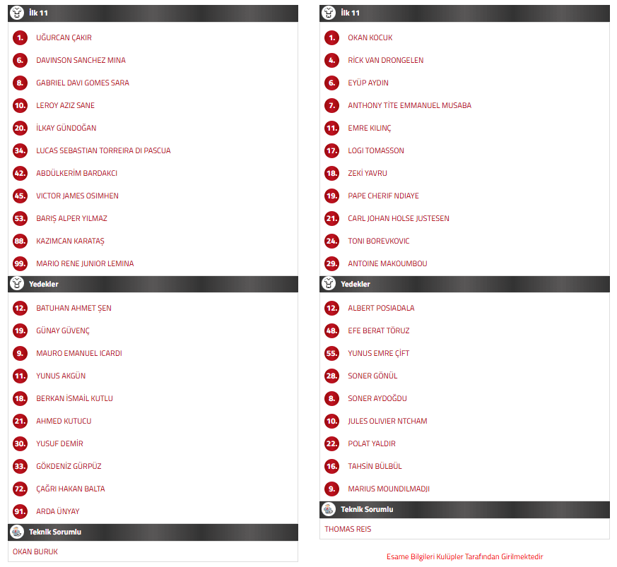 Galatasaray’da Wilfried Singo, Ismail Jakobs ve Roland Sallai sakatlık veya ceza gerekçesiyle kadroda yer almayacak. Bahis soruşturması kapsamında hak mahrumiyeti cezası alan Eren Elmalı ve Metehan Baltacı da maçta görev yapamayacak.