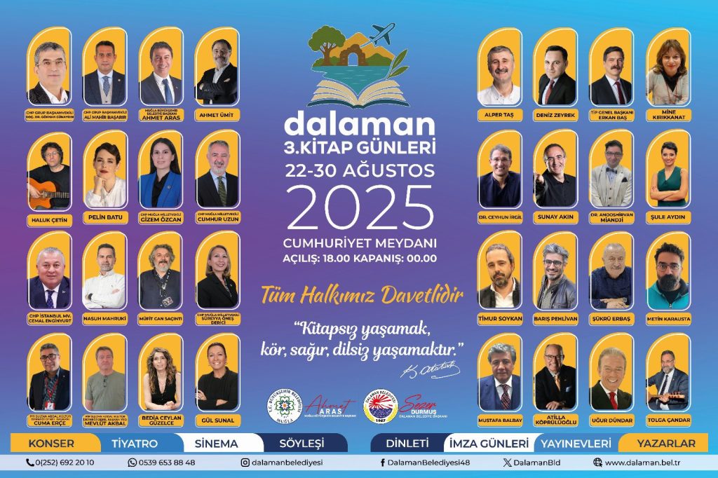 Dalaman Belediyesi’nin düzenlediği 3. Dalaman Kitap Günleri 22 Ağustos Cuma günü başlıyor. Etkinlikte Uğur Dündar, Şule Aydın, Timur Soykan, Pelin Batu ve Ahmet Ümit gibi isimlerin yer alacağı aktarıldı.