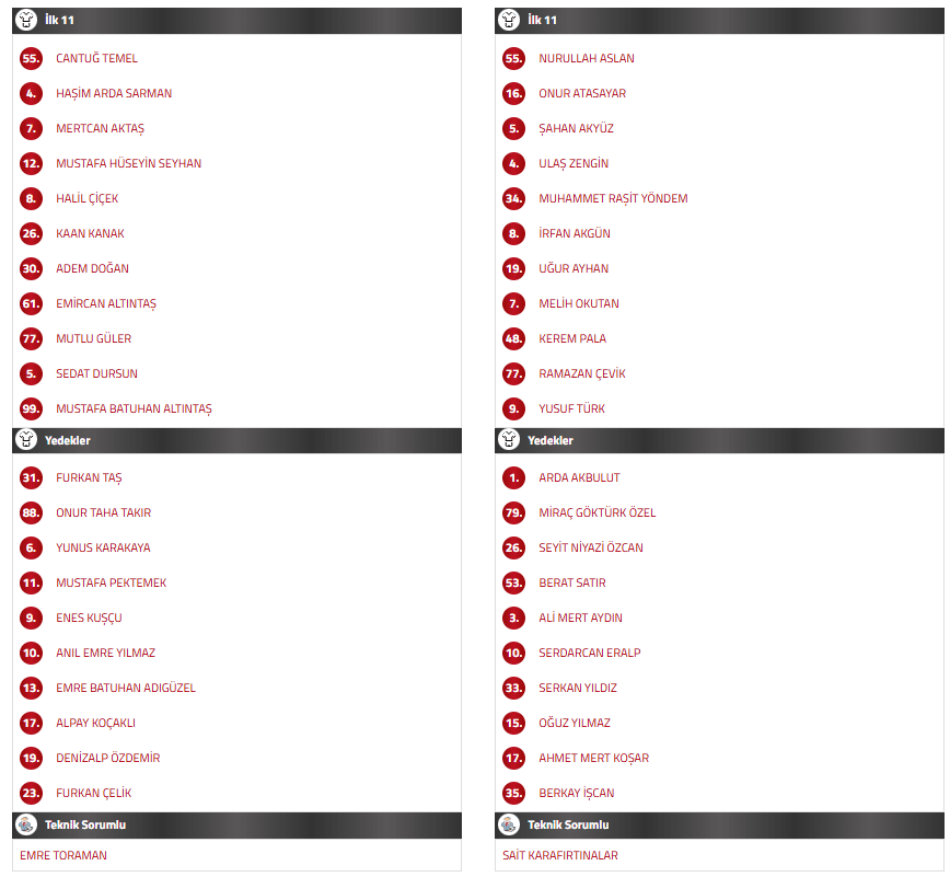 Maçın başlamasına bir saat kala her iki takımın da ilk 11’leri Türkiye Futbol Federasyonu’nun resmi internet sitesinde yayınlandı. İşte ilk 11’ler: