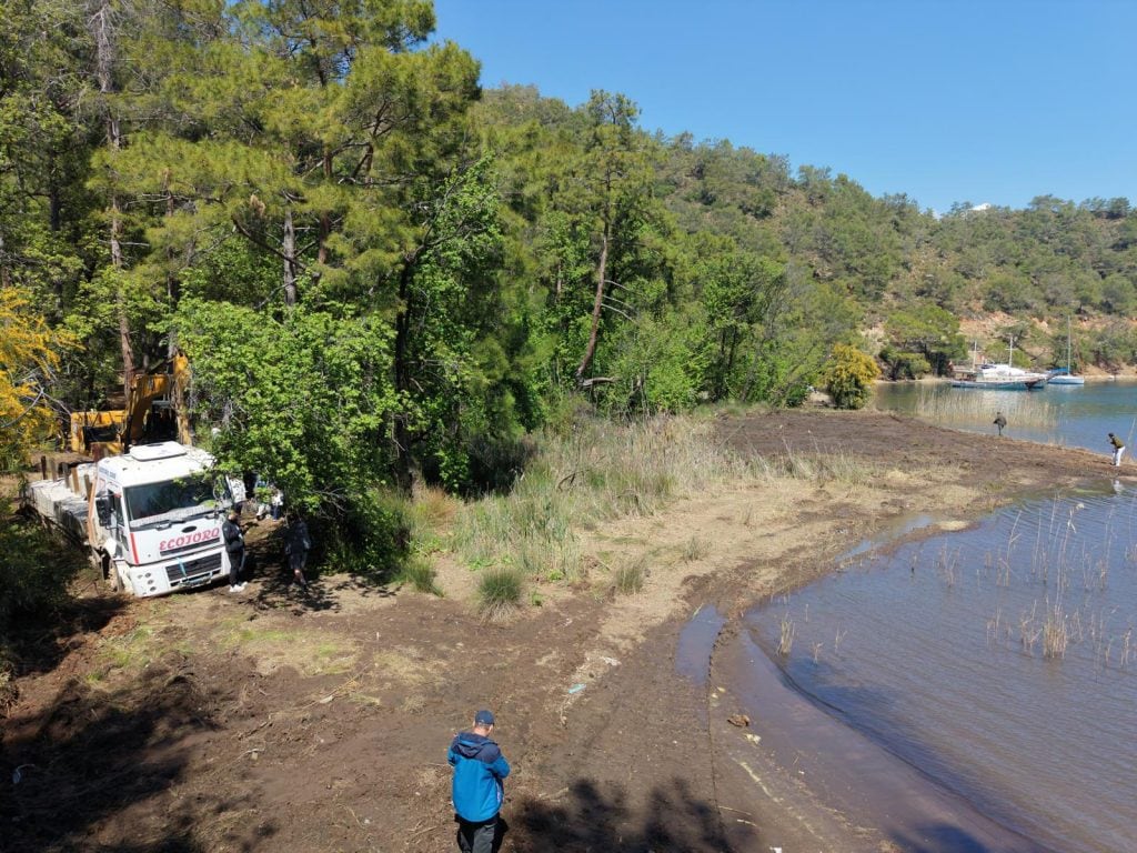 Muğla’nın Fethiye ilçesindeki Göcek Mahallesi’nde bulunan Osmanağa Koyu’ndan dün (26 Mart) sabahın erken saatlerinden itibaren iş makinelerinin koyda çalışma yaptığı gözlendi.