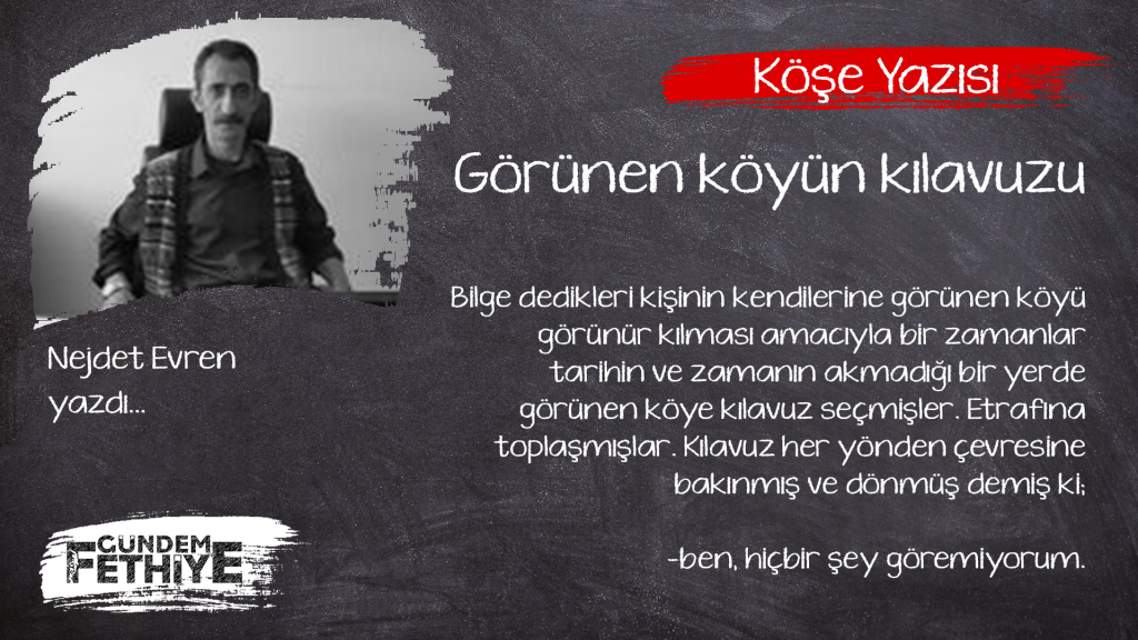 Kılavuz kıpırdanmaya başlamış üç adım ileri iki adım geri gide-gele çevredekilerden adım adım uzaklaşmaya başlamış; doğrusu, kendi de uzaklaştığının fakında değilmiş. Gide-gide kendini bir köyde bulmuş. Her yan ışıl ışıl aydınlıkmış. “bu, bir serap olmalı” diye içinden geçirmiş. Gözlerine inanamamış, bu durumu test etmek için elleriyle taşa-toprağa, börtü-böceğe, sese-çığlığa her ne varsa dokunmuş; dokundukça avuçlarının içinin yandığını hissetmiş. Bu denli yakıcı ve bu denli parlayan bir köy nasıl olur da görünmez diye düşünmeye başlamış.