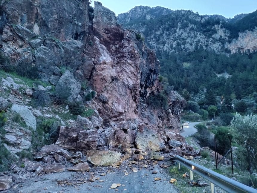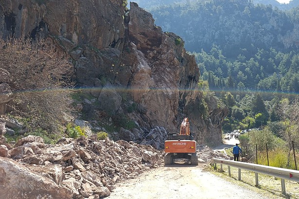 Muğla’nın Fethiye ilçesine bağlı Faralya Mahallesi’nde heyelan sonucu yola düşen kayaların, yolu ulaşıma kapatmasına dair…