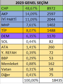 Geçtiğimiz 2023 Genel Seçimlerinde ise Datça’da CHP, oylarını artırmış. 8 bin 972 oy almış ama oy oranı yüzde 50’nin altında. Zira katılım 2019 seçimlerine nazaran neredeyse yüzde 10 artmış. Yeni katılanlar da daha çok CHP’ye oy vermiş. MHP ve AKP ayrı ayrı girmiş, İYİ Parti de merkezde ittifak yaptığı CHP’ye rağmen seçime girmiş. Hepsinin oylarının toplamı, 6 bin 043 yani toplam oyların yüzde 33’ünü almışlar. MHP+AKP+İYİ Parti, sayı olarak 2019 yerel seçimlerine yakın bir oy toplamış. TİP – YSP – SOL Parti ise 2 bin 740 oy almış (kullanılan oyların yüzde 14-15’i). HDP’nin 2019 yerel meclis için aldığı oylara göre neredeyse yarıya yakın artırmış. Son olarak diğer partiler de çoğalmış ve 700’e yakın oy almış.
