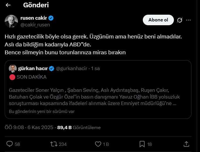 İfade çağrısı yapılan gazeteci Ruşen Çakır, sosyal medya hesabından yaptığı açıklamada, “Üzgünüm ama henüz beni almadılar. Aslı da bildiğim kadarıyla ABD’de.” paylaşımında bulundu.