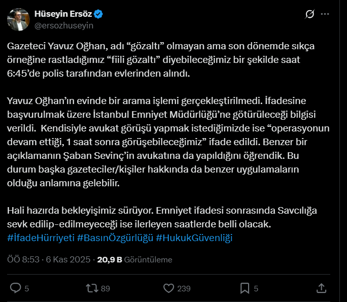 “Gazeteci Yavuz Oğhan, adı ‘gözaltı’ olmayan ama son dönemde sıkça rastladığımız ‘fiili gözaltı’ diyebileceğimiz bir şekilde saat 6.45’te polis tarafından evinden alındı. Aynı durum Şaban Sevinç için de geçerli. Emniyet ifadesi sonrasında savcılığa sevk edilip edilmeyecekleri ilerleyen saatlerde belli olacak.”