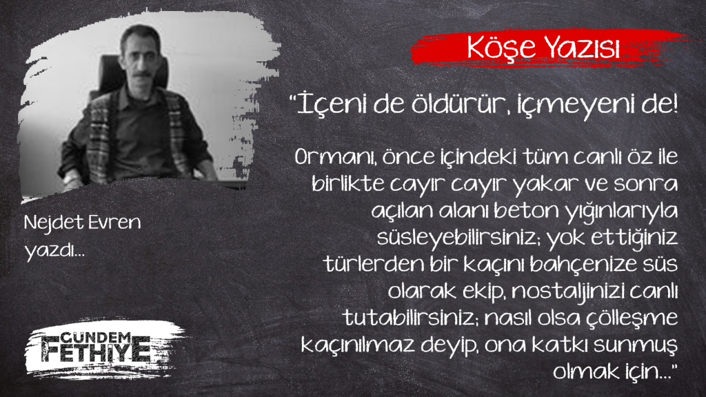 Kapının zili üç kere çaldı. Oysa, tatil-günün keyfini çıkartıp, öğlene kadar uymak istiyordu. Söylene, söylene yataktan kalktı. Kapıyı açtığında kimsecikler yoktu ortalıkta. Beyaz bir paket, kapı önündeki eşiğe bırakılmıştı. Beyaz paketin üzerinde siyah ve kalın harflerle “ACABA NEDİR? NEDİR? NEDİR?” diye yazılıydı. Çay yanında simit yerine, bisküvi de iyi gider diye düşündü. Paketin üzerindeki söz … İçeni de öldürür, içmeyeni de! okumayı sürdür