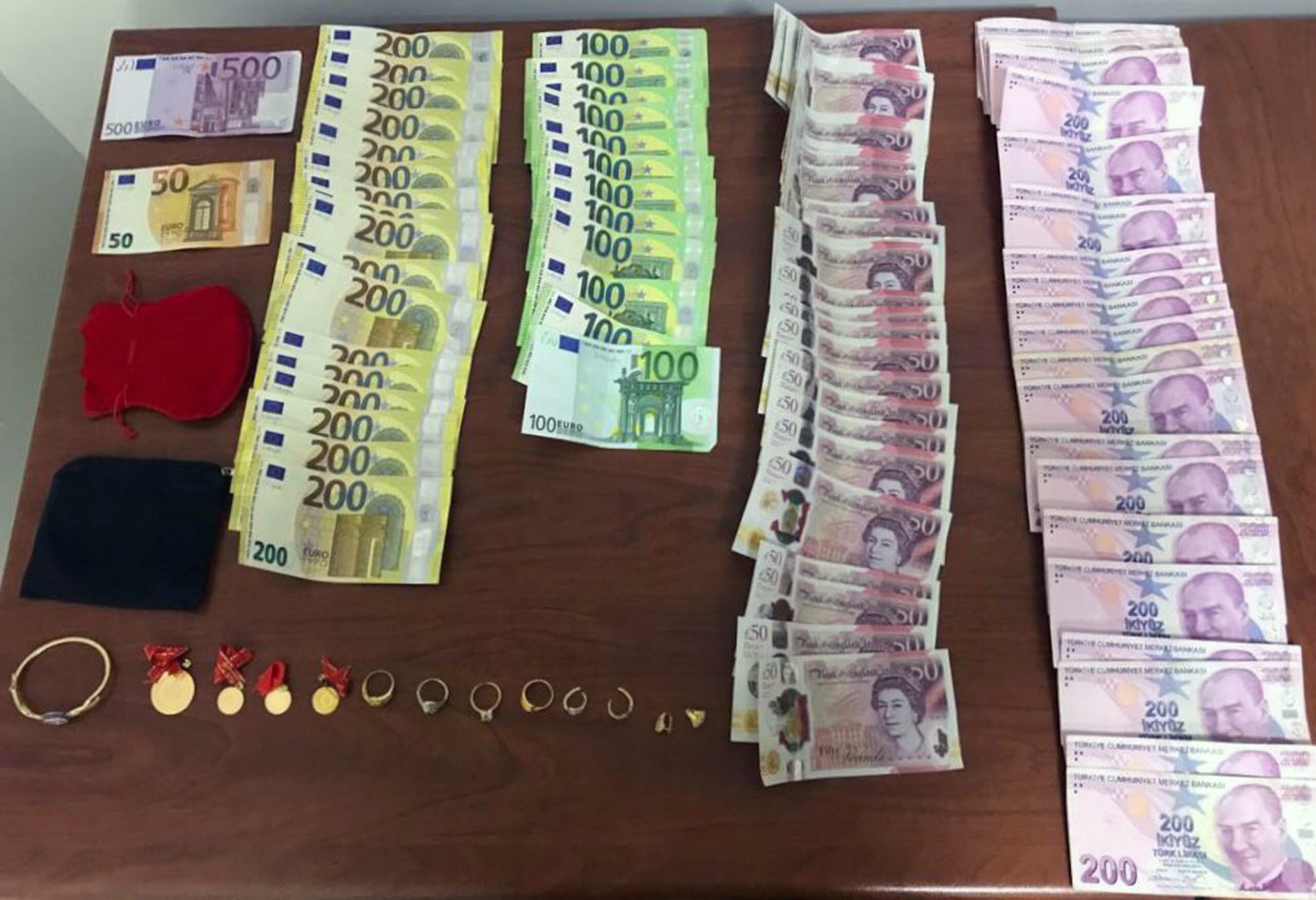 Araç içerisinde yapılan kontrolde, çalınan dört adet altın yüzük, iki çift altın küpe, üç çeyrek altın, altın bilezik, bir tam altın, 2 bin 400 Sterlin, 8 bin 150 Euro, 8 bin Türk Lirası’nın ele geçirildiği ileri sürüldü.