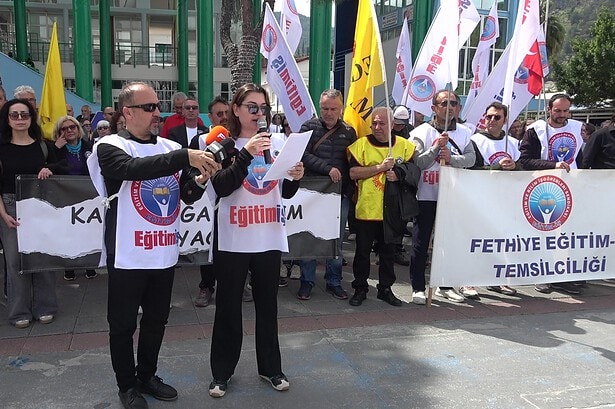 Şanlıurfa’da bir okula düzenlenen saldırı sonrası Muğla’nın Fethiye ilçesinde, Eğitim Sen ve Eğitim İş basın…