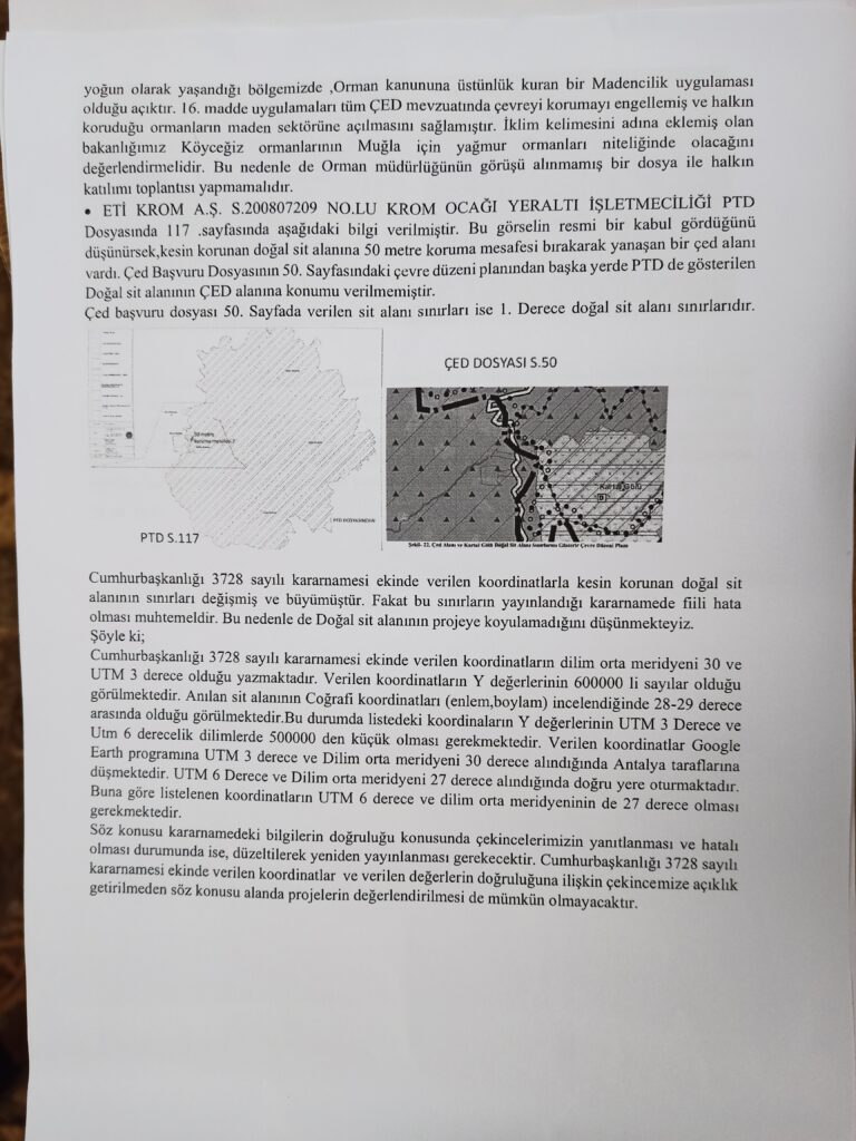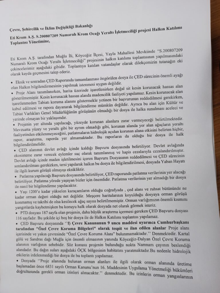 “29 Eylül 2022 günü Yayla Köyü’nde yapılacak olan ETİ KROM A.Ş. Halkın Katılımı Toplantısı’na bölge halkı hazır bulunmuş, toplantı koşulları firma tarafından sağlanmadığı için toplantı Bakanlık tarafından iptal edilmek durumunda kalınmıştır. Kamusal bir toplantının iptalini, firmanın üstüne düşeni yapmaması nedeniyle yapamadık. Halk kendi koşulları ile bu alana benzin ve zaman harcayarak geldiği için kamusal zarar oluşmuştur. Bu konuda cezai bir işlem yapmak gerektiği düşüncesindeyiz.”