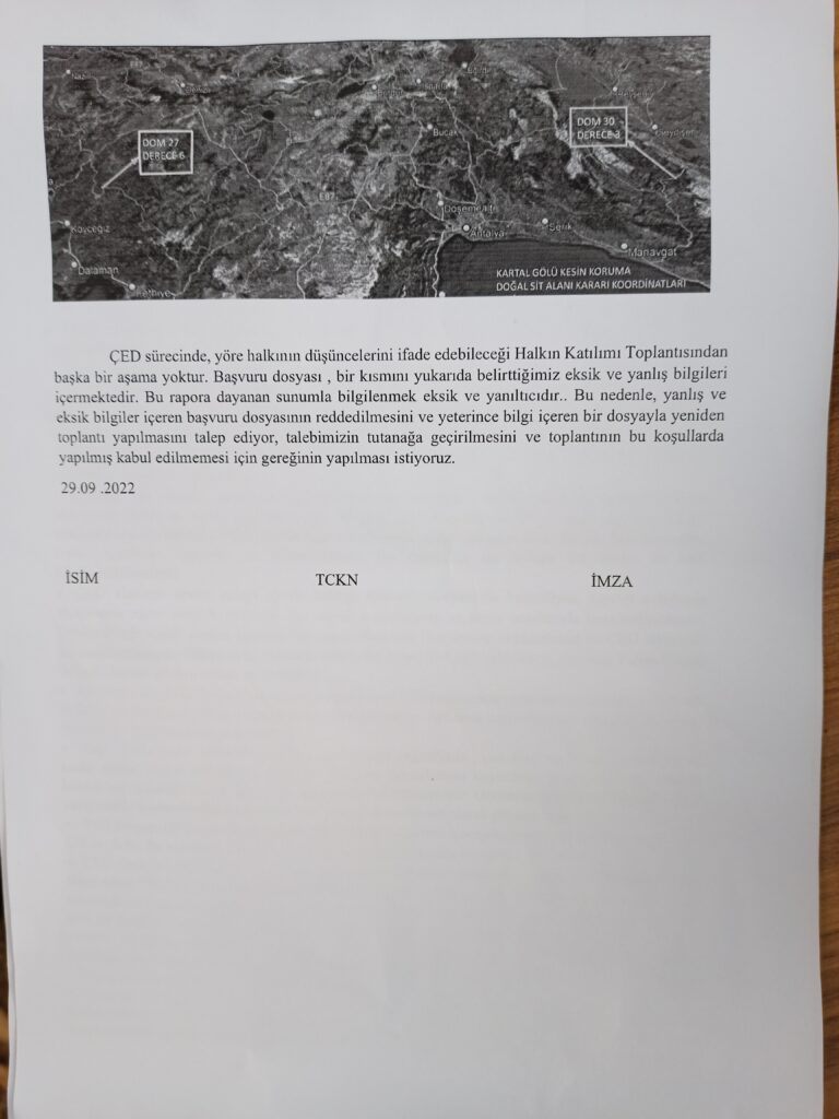 Dilekçede projenin başvuru dosyasının eksik ve yanlış bilgilendirme içerdiği için bu rapora dayanan sunumun ile bilgilenmenin de eksik ve yanıltıcı olduğunu dile getirildi. Yöre halkının projeye dair düşüncelerini ifade edebileceği, “Halkın Katılımı Toplantısı”ndan başka bir aşama bulunmaması nedeniyle de yanlış ve eksik bilgi içeren başvuru dosyasının reddedilerek yeni bir dosya hazırlanması ve yeniden toplantı yapılması talep edildi.