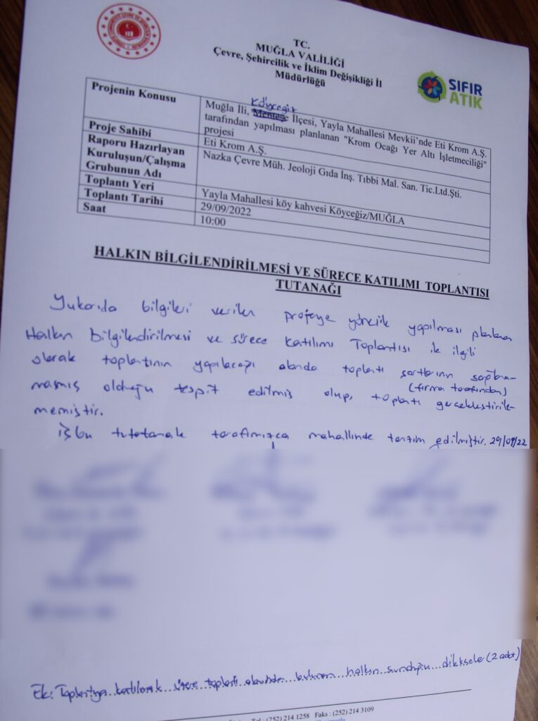 Muğla’nın Köyceğiz ilçesine bağlı Yayla Mahallesi’nde, 20 Temmuz 2022 tarihinde Eti Krom A.Ş’nin ÇED süreci için başvuru yaptığı “Krom Ocağı Yeraltı İşletmeciliği” projesinin bugün gerçekleşmesi planlanan Halkın Hatılını Toplantısı yurttaşlar tarafından yaptırılmadı.