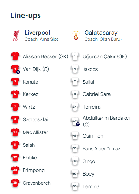Maçın başlamasına kısa bir süre kala takımların ilk 11’leri UEFA’nın resmi internet sitesinde yayınlandı. İşte Liverpool – Galatasaray maçı ilk 11’leri: