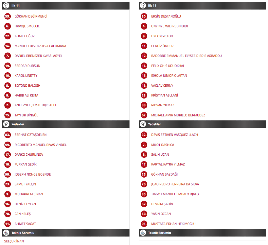 Maçın başlamasına bir saat kala her iki takımın da ilk 11’leri Türkiye Futbol Federasyonu’nun internet sitesinde açıklandı. İşte ilk 11’ler: