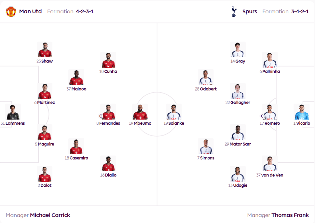 Premier Lig’in 25’inci haftasında Manchester United ile Tottenham karşı karşıya geliyor. Old Trafford’da oynanacak mücadele öncesinde iki takımın sahaya çıkacağı ilk 11’ler ve maç kadroları açıklandı.
