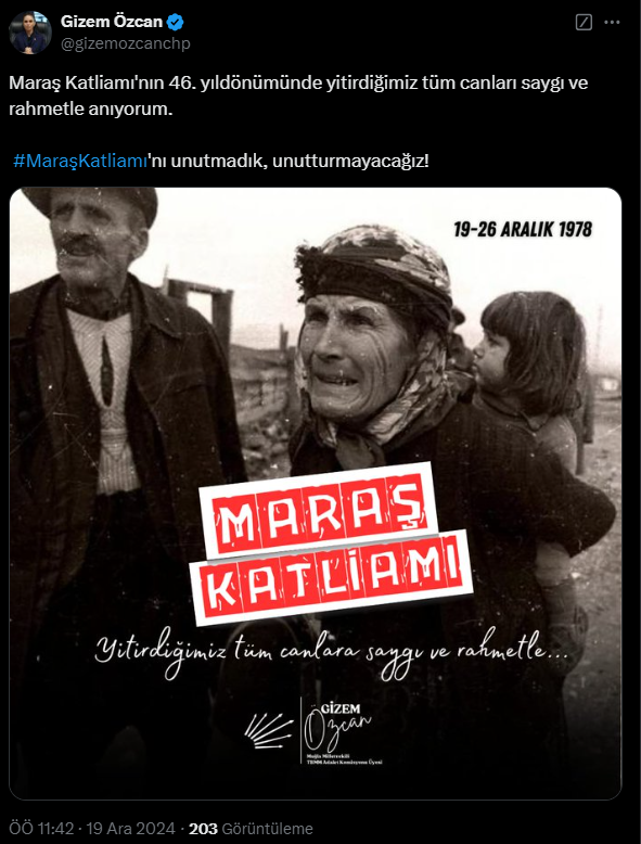“Yakın tarihimizin kara bir lekesi olan Maraş Katliamı’nın acısı hala yüreklerimizde. 46.’ncı yıl dönümünde, bu insanlık dışı olayda yitirdiğimiz canlarımızı saygıyla anıyorum. Unutmadık, unutmayacağız!”