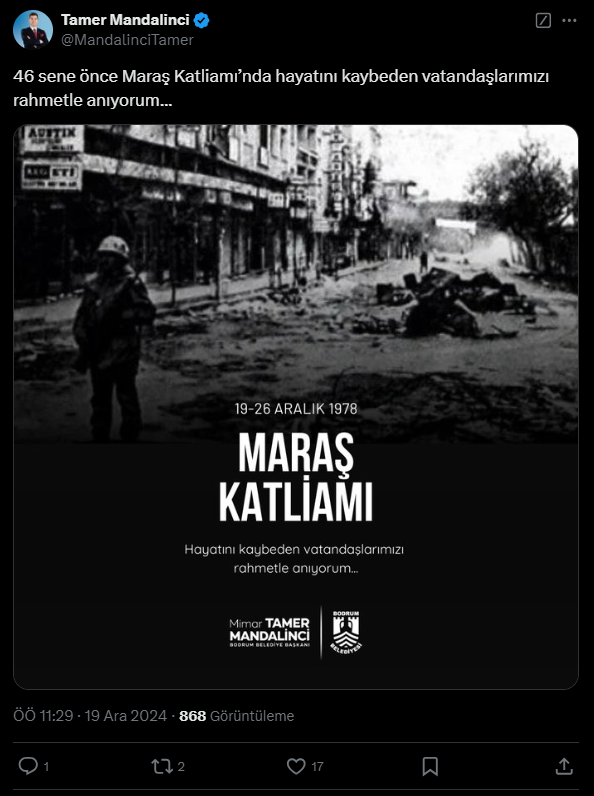 Bodrum Belediye Başkanı Tamer Mandalinci ise Maraş Katliamı’na ilişkin sosyal medya paylaşımında şunlara yer verdi:
