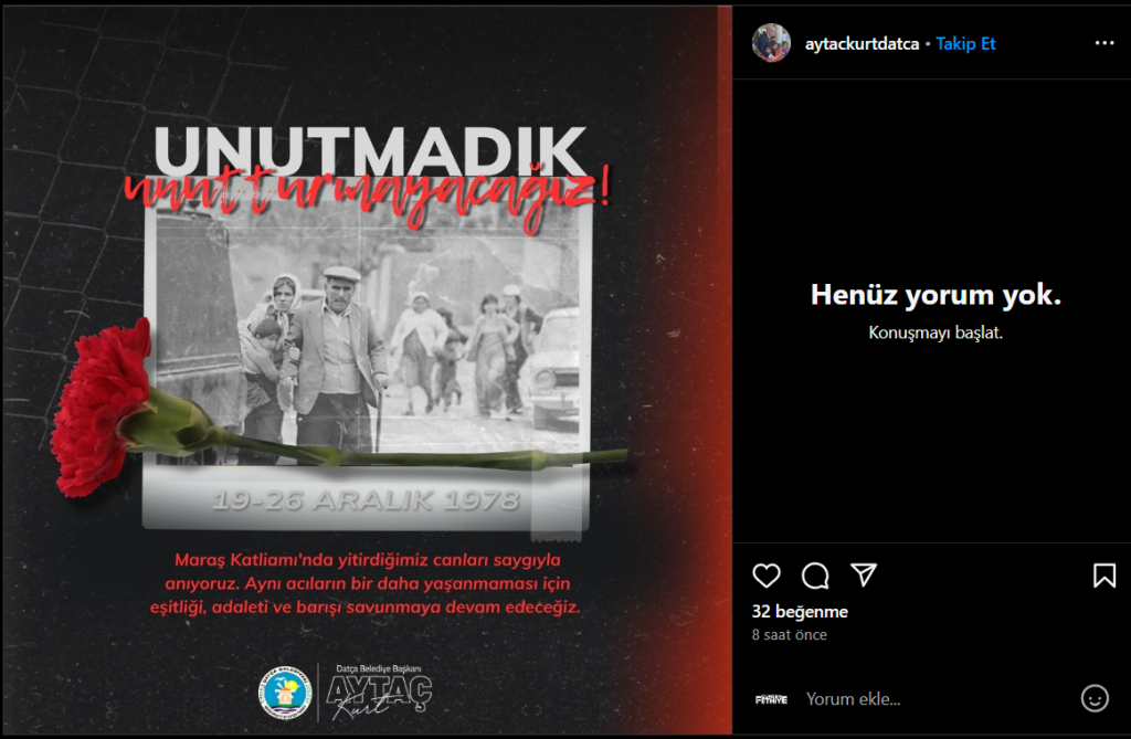Datça Belediye Başkanı Aytaç Kurt ise sosyal medya hesabından Maraş Katliamı ile ilgili bir görsel paylaştı