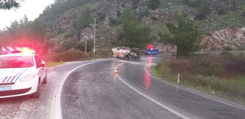 Muğla’nın Marmaris ilçesine bağlı Turgut Mahallesi’nden Orhaniye Mahallesi’ne seyreden R.O. idaresindeki beton mikseri, sürücüsünün direksiyon hakimiyetini kaybetmesi sonucu devrildi.