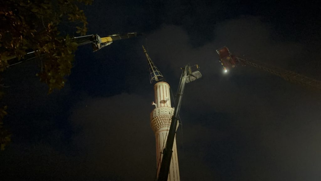 Camiden yurttaşlara uyarılar yapıldı ve itfaiye ekiplerinin, külahı sökmek için çalışma başlattığı belirtildi. Külahın tamir edilip tekrar yerine takılacağı ifade edildi.