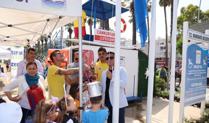 Marmaris Belediyesi’ne ait merkez ve İçmeler halk plajlarının mavi bayrakları, 5 Haziran Dünya Çevre Günü’nde öğrencilerle birlikte çekildi.