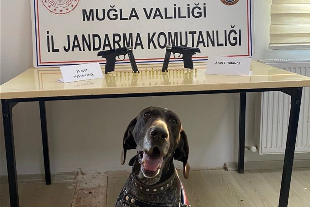 Bomba arama köpeği “Veda” ile birlikte araçta yapılan aramada, arka koltuğun altına zulalanmış şekilde iki kurusıkıdan bozma seri numarası kazınmış 9 milimetre çapında tabanca, tabancalara ait şarjör, iki tabanca fişeği yakalandı.
