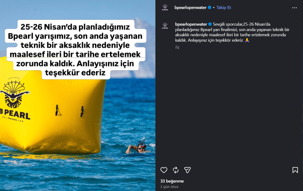Muğla’nın Marmaris ilçesinde 25-26 Nisan 2026 tarihinde düzenlenmesi planlanan B Pearl Açık Deniz Yüzme Yarışması’nın “teknik bir aksaklı nedeniyle” ileri tarihlere ertelendiği duyuruldu.