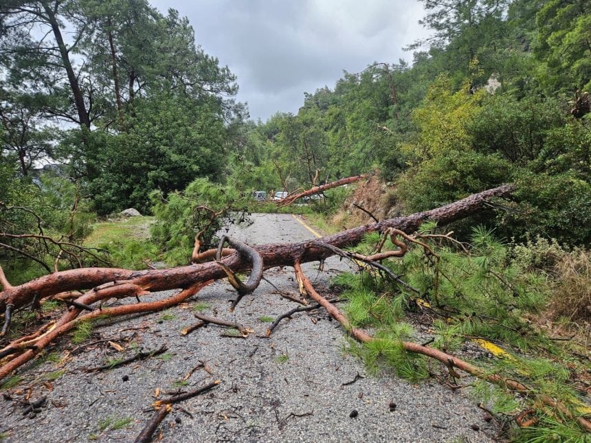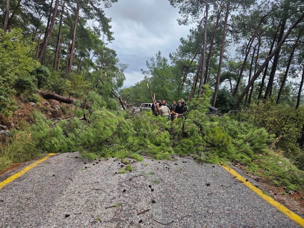 Muğla‘nın Menteşe ilçesindeki Sarnıç Mahallesi’nden Akbük Mevkii’ne ulaşımı sağlayan karayolu üzerinde etkisini gösteren fırtına, yol kenarında bulunan üç çam ağacını kökünden sökerek yola devirdi.