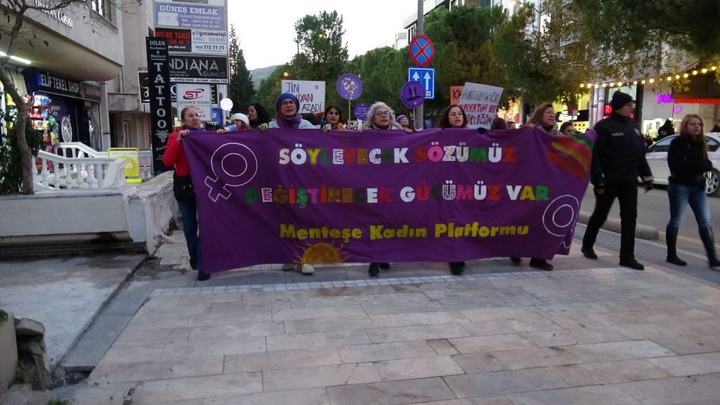 Menteşe Kadın Platformu’nun çağrısıyla kadınlar, 25 Kasım Kadına Yönelik Şiddete Karşı Uluslararası Mücadele Günü kapsamında Muğla’nın Menteşe ilçesinde yürüyüş düzenledi ve basın açıklaması yaptı. Açıklamada, “Tüm kadınları ve LGBTİ+ları mücadeleyi birlikte büyütmeye çağırıyoruz” denildi.