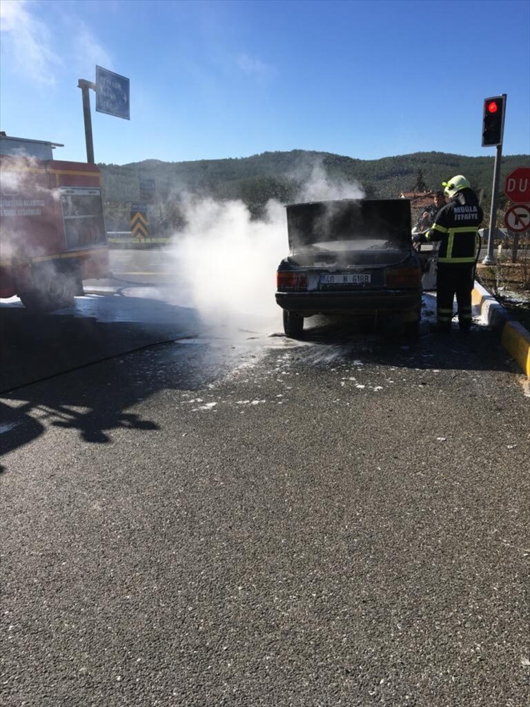 Muğla-Marmaris kara yolunun Gülağzı kavşağında motor kısmından alev alan otomobili sürücü terk etti. İhbar üzerine olay yerine itfaiye ekipleri geldi.