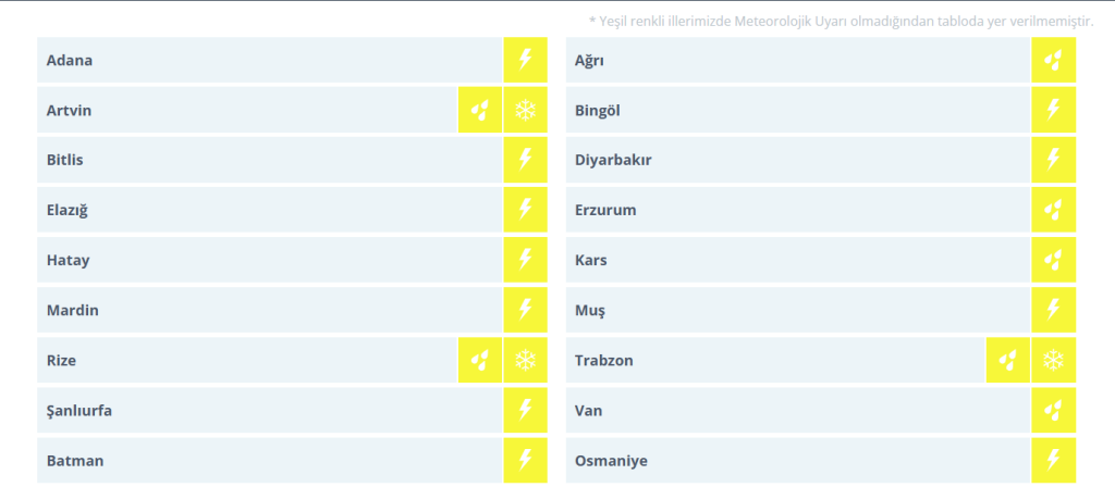 Yarın için sarı alarm verilen iller şöyle sıralandı: Ağrı, Artvin, Bingöl, Bitlis, Diyarbakır, Elazığ, Erzurum, Kars, Mardin, Muş, Rize, Trabzon, Şanlıurfa, Van ve Batman.
