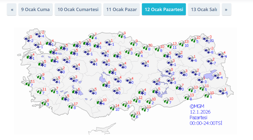 Meteoroloji tahminleri, 12 Ocak Pazartesi günü İstanbul’da karla karışık yağmur, yüksek kesimlerde ise kar yağışı ihtimaline işaret ediyor. AKOM, pazartesi günü özellikle yüksek bölgelerde kuvvetli kar görülebileceği uyarısını paylaştı.