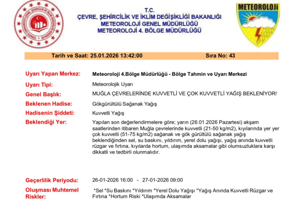 Meteoroloji 4. Bölge Müdürlüğü Bölge Tahmin ve Uyarı Merkezi, yarın (26 Ocak 2026) akşam saatlerinden itibaren Muğla çevrelerinde kuvvetli, kıyılarında ise yer yer çok kuvvetli sağanak ve gök gürültülü sağanak yağış beklendiğini duyurdu.