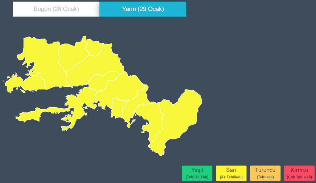 Sarı kodlu uyarı, havada potansiyel tehlike durumuna işaret ediyor. Tahmin edilen meteorolojik hadise olağan dışı olmamakla birlikte, meteorolojik şartlardan etkilenebilecek faaliyetler konusunda dikkatli davranılması uyarısında bulunuluyor.