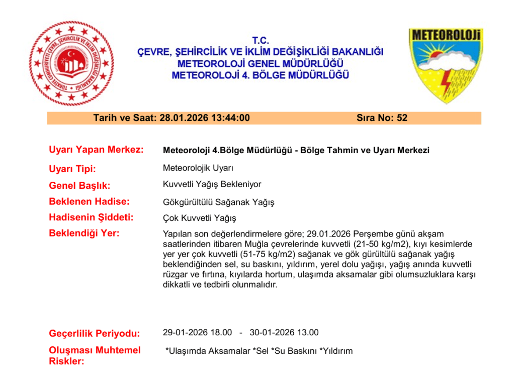 Meteoroloji 4. Bölge Müdürlüğü Tahmin ve Uyarı Merkezi tarafından yapılan uyarıda, yarın (29 Ocak) akşam saatlerinden itibaren Muğla çevrelerinde kuvvetli sağanak ve gök gürültülü sağanak, yani metrekareye 21 ile 50 kilogram yağış düşmesinin beklendiğini açıkladı.