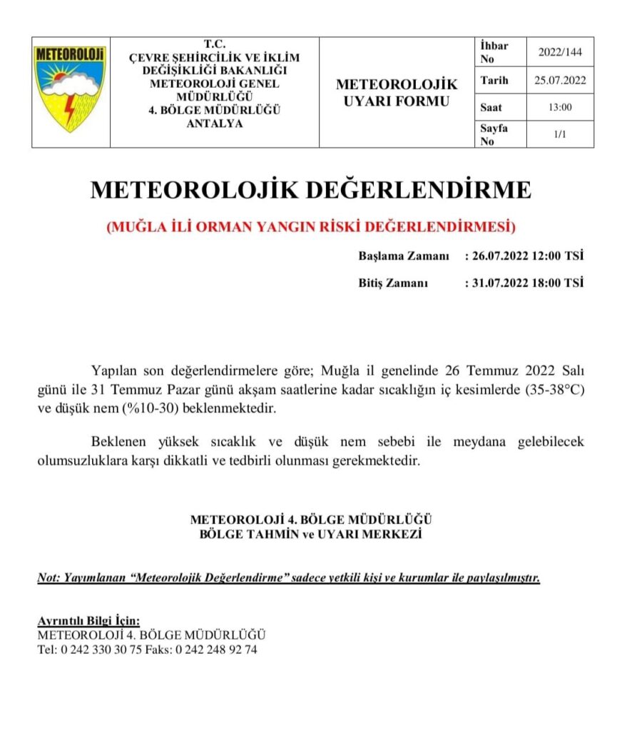 “Yapılan son değerlendirmelere göre; Muğla il genelinde 26 Temmuz 2022 Salı günü ile 31 Temmuz Pazar günü akşam saatlerine kadar sıcaklığın iç kesimlerde (35-38°C) ve düşük nem (%10-30) beklenmektedir.