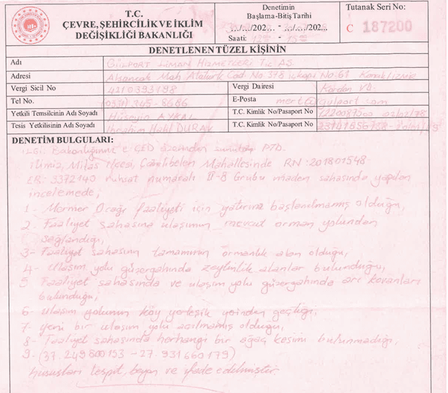 Diğer yandan Proje Tanıtım Dosyası’nda yer alan Çevre, Şehircilik ve iklim Değişikliği Bakanlığı tarafında proje alanında yapılan denetleme tutanağı da yer aldı. Bu tutanağa göre, sahada mermer ocağı faaliyeti için yatırıma başlanmamış olduğu dile getirildi.
