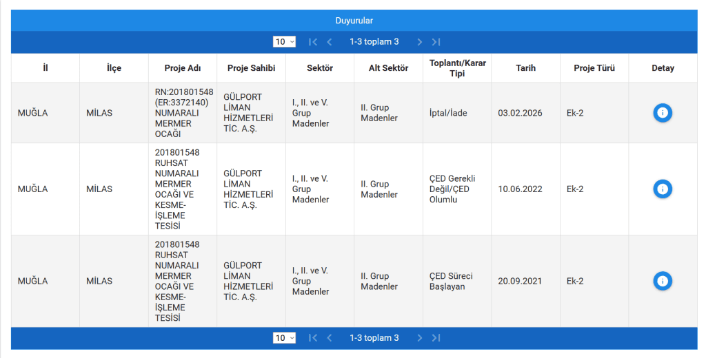 Muğla’nın Milas ilçesine bağlı Çamlıbelen Mahallesi’nde Gülport Liman Hizmetleri Ticaret Anonim Şirketi tarafından yapılmak istenen “RN:201801548 (ER:3372140) Numaralı Mermer Ocağı” projesinin ÇED süreci, 3 Şubat 2026 tarihinde Muğla Valiliği tarafından iptal edildi.