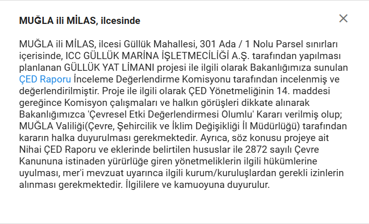 Muğla’nın Milas ilçesine bağlı Güllük Limanı’nda, ICC Güllük Marina İşletmeciliği A.Ş. tarafından yapılmak istenen denizde en fazla 260 yat bağlama kapasitesine sahip “Yat Limanı Projesi” için Çevresel Etki Değerlendirme (ÇED) süreci 16 Mart 2023’te, Halkın Katılımı Toplantısı (HKT) ile başlamıştı.