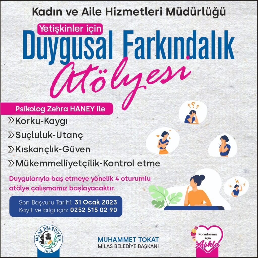 Muğla’da Milas Belediyesi Kadın ve Aile Hizmetleri Müdürlüğü tarafından hazırlanan Duygusal Farkındalık Atölyesi’ne başvuruların başladığı bildirildi.