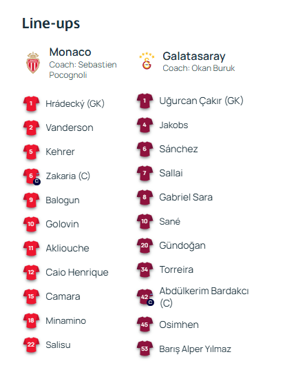 Ev sahibi ekip Monaco’da da önemli oyuncuların durumu belirsizliğini koruyor. Ansu Fati, George Ilenikhena, Folarin Balogun, Denis Zakaria, Christian Mawissa ve Eric Dier’in sağlık durumları maç saatinde netleşecek. Bu sezon altışar gol kaydeden Fati ile Balogun’un yanı sıra ikişer golü bulunan Ilenikhena ve Dier’in eksikliği Galatasaray savunması açısından avantaj sağlayabilir.