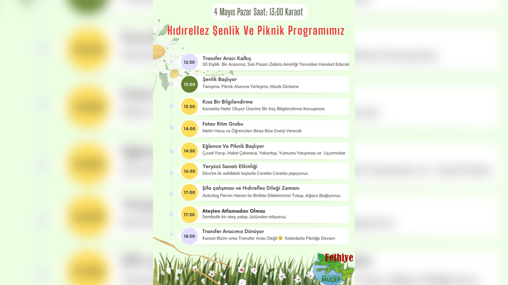 MUÇEP Fethiye Meclisi, Muğla’nın Fethiye ilçesinde 4 Mayıs’ta çeşitli etkinliklerle “Hıdırellez Şenliği ve Piknik” düzenleyecek.