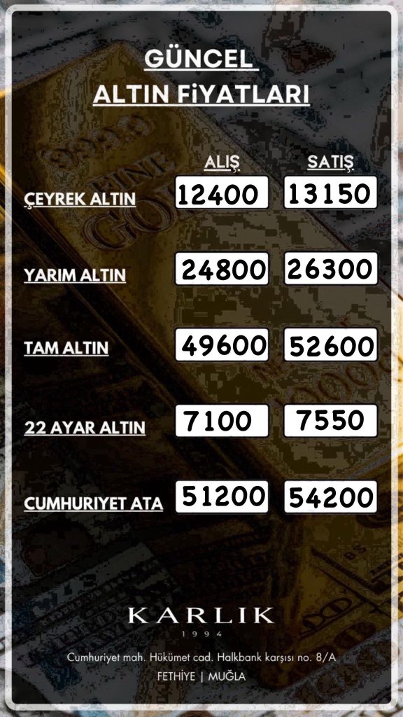 1 Mart 2026 Pazar günü Muğla’daki altın fiyatları yatırımcılar tarafından yakından izleniyor. İşte Fethiye Karlık Kuyumculuk’ta güncel altın alış-satış fiyatları:
